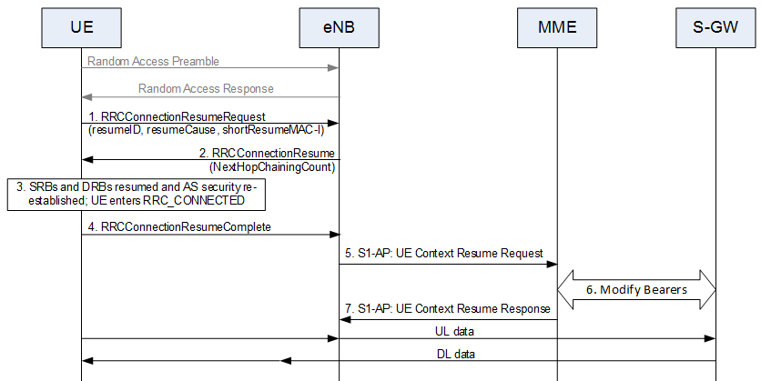 如果有上行数据或者寻呼通知到来,UE会通过高层触发RRC连接恢复流程。当网络侧接收UE恢复请求后,UE从RRC_IDLE状态转变为RRC_CONNECTED状态。RRC层依据UE之前存储的AS上下文和接收来自网络侧的RRC配置信息重新对UE进行配置。RRC连接恢复流程重新激活安全机制和重建SRB和DRB。Resume请求携带resumeIdentity,该请求不被加密,但是进行MAC(message authentication code)保护。