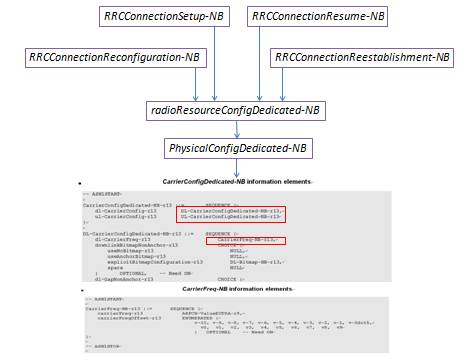 如图所示,RRC在连接建立,重配,恢复,重建立等信令中都可以通知UE可以从非锚定载波接入进行数据传输。UE对于以上信令的反馈都在非锚定载波进行发送。这表示非锚定载波的接入可能分别发生在初始连接建立、小区间切换流程、RRC连接恢复流程以及RRC连接重建立流程中。