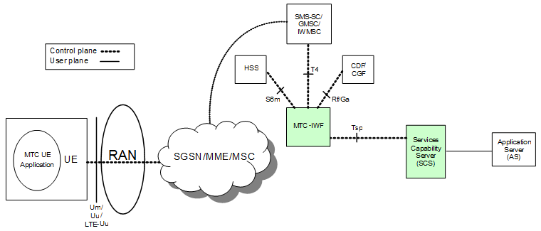 SCS通过Tsp接口向位于HPLMN的MTC-IWF发送Device Trigger,详见29.368