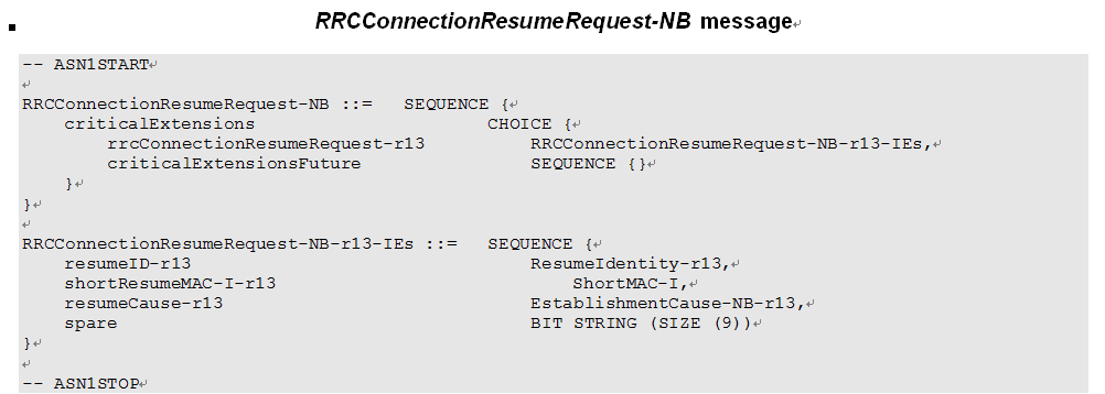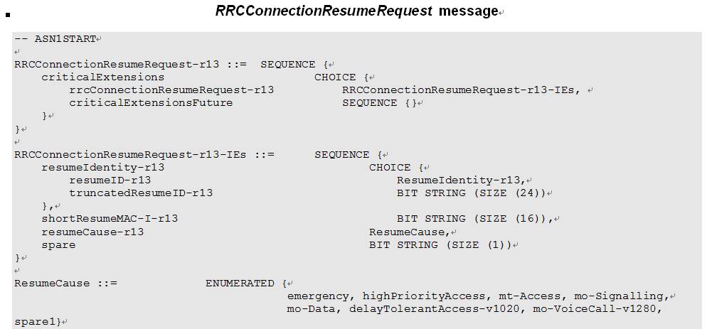 恢复是针对“挂起”流程而言的,为了使得NB-IoT终端更加省电,协议设计了“挂起-恢复”流程(当然该流程也可以适用大网),网络侧通过RRCConnectionRelease消息中的 rrc-Suspend字段告诉UE,RRC连接被挂起,UE存储接入层协议栈上下文和resumeIdentity,同时从连接态转变为RRC_IDLE(空闲态),挂起针对RRC层已建立的至少1个DRB,这也意味着对于NAS层协议栈传送小数据的NB-IoT终端,“挂起-恢复”流程是不适用的。恢复流程会重新激活安全模式和重新建立信令和数据承载,相比RRCConnectionRequest,不需要有后续安全模式控制流程了。这样可以使得终端快速“恢复”与网络侧的连接。另外,相比R13之前的协议版本中RRCConnectionRequest的触发原因,RRCConnectionResumeRequest多出一条mo-VoiceCall(R13中两者是中所含的触发原因是保持一致的)。如果触发原因是多媒体电话视频业务请求,并且驻留小区SIB2消息中包含voiceServiceCauseIndication,那么RRC接入/恢复的触发原因就可以设置为mo-VoiceCall,值得注意的是现网VoLTE主叫触发原因是mo-Data。从这里看出,窄带物联网也不仅仅是传输数据,还可以传送语音。