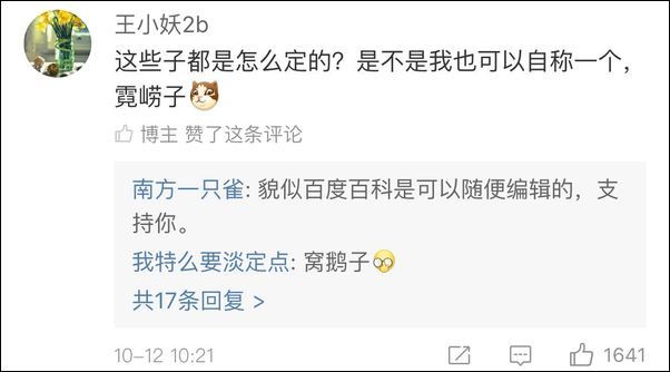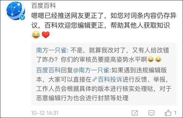 百度百科官方也在博主@南方一只雀 的微博下就此事进行了申明。