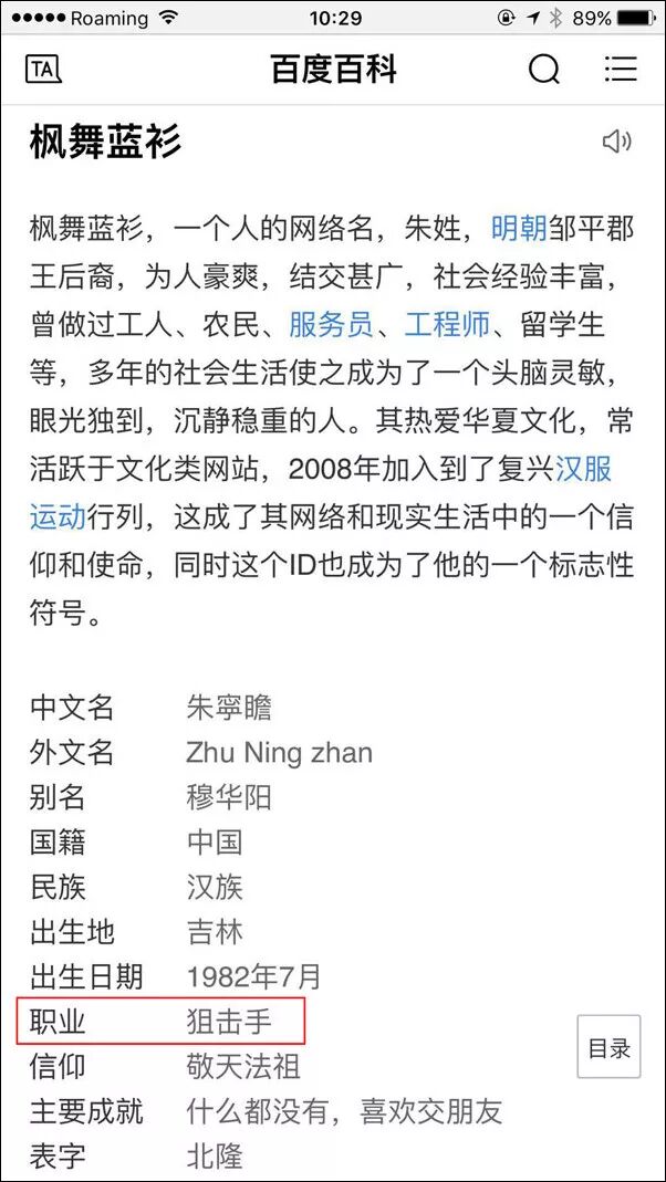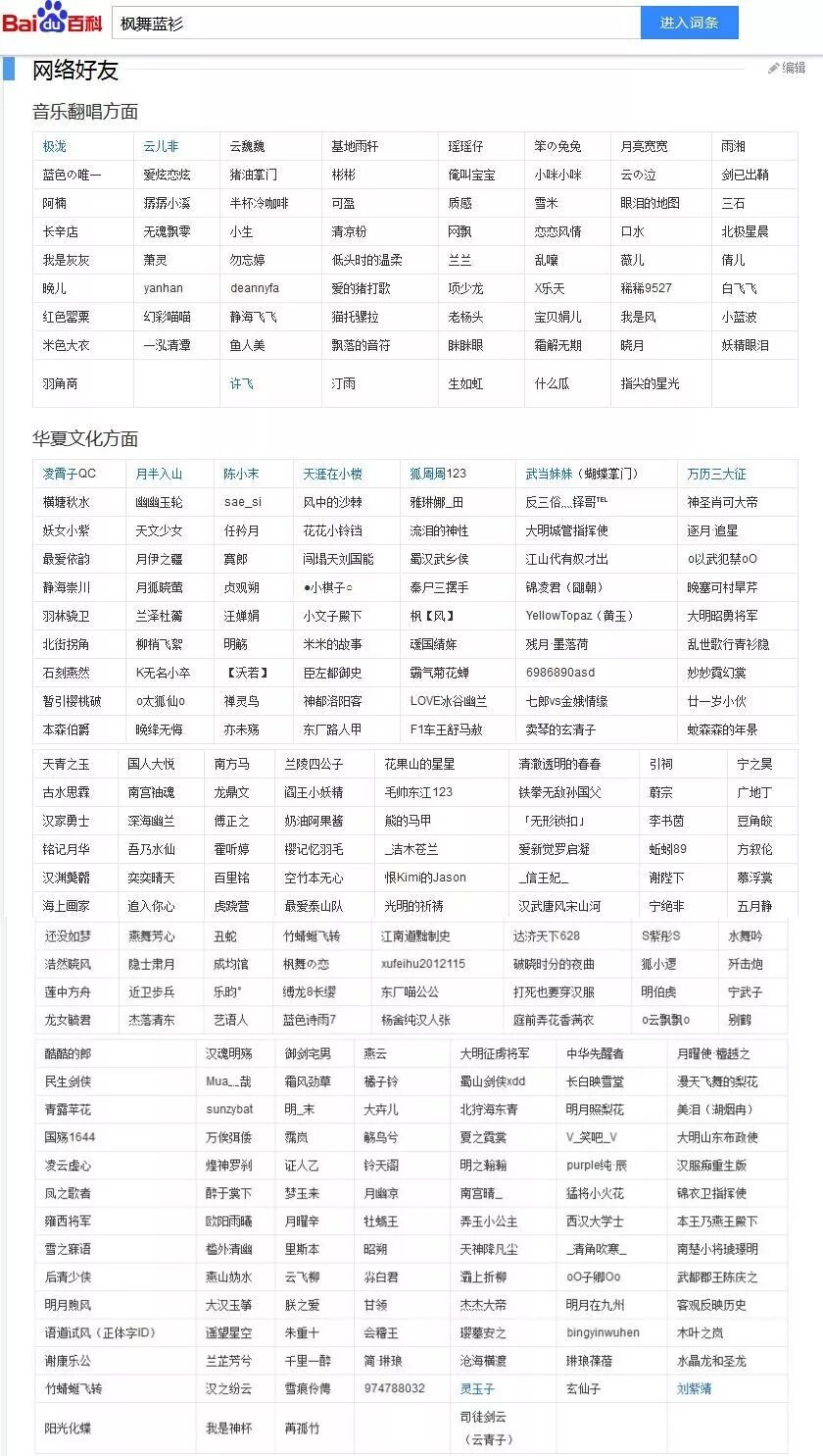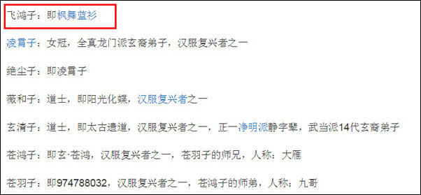 这位“飞鸿子”的网名“枫舞蓝衫”也有一个百度词条,内容槽点太多,甚至不知道该从何吐起…