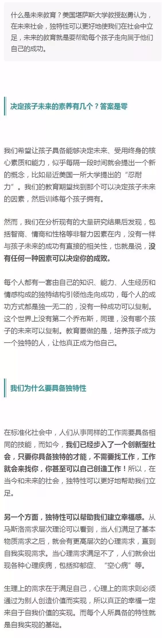 总而言之,什么是未来教育?我认为,未来一定会构造出彻底的、一个私人订制的、全球性、自我的学习环境。未来,每个学生必须要独特而优秀才具备存在价值。如果每个人的价值是可复制的,他迟早会被机器所取代。每个人都有自己的优势和劣势,未来教育必须要根据每个人的特性为他铺设属于自己的成功之道。