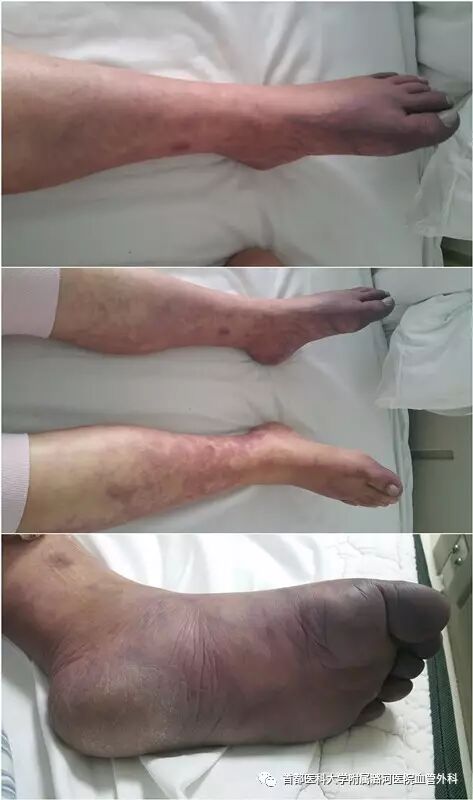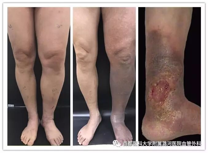 - 后期因下肢静脉压升高,导致下肢静脉瓣关闭功能不全,最终引起下肢静脉淤血症状:浅静脉曲张、小腿色素沉着、慢性溃疡等。