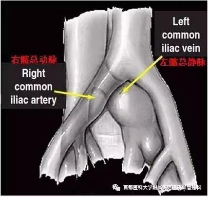 左右髂总静脉于第5腰椎体中下部平面右侧汇合成下腔静脉,右侧髂总静脉几乎呈直线与下腔静脉连续,左侧髂总静脉自盆腔横行向右,经腰骶椎前侧,与下腔静脉几乎成直角汇合。腹主动脉相当于4腰椎分出左右髂总动脉,右侧髂总动脉跨越左侧髂总静脉之前方,然后向骨盆右下延伸。左侧髂总静脉在前方受右侧髂总动脉的骑跨,后方受腰骶部生理性前凸的推挤,造成前压后挤。