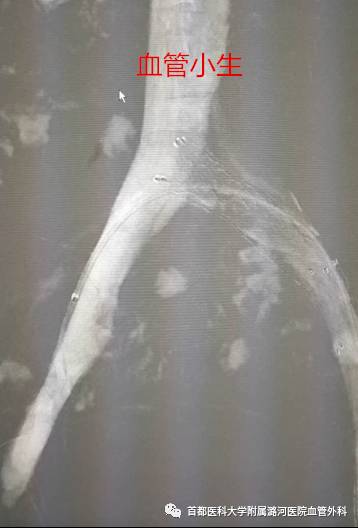 撤回导丝或跟进导管推注少量造影剂。如确认导丝在血管外应退回导丝、导管,可继续手术,旋转球管,调整导丝、导管方向,结合髂静脉正常解剖走向尝试其他通道通过病变段.若有大量造影剂外渗时