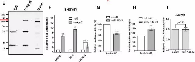 ▲ 为了证实miR-143-3p与lncND的结合,作者用到了AGO2-IP实验,发现AGO2蛋白的抗体可以很好的富集lncND, 而后荧光素酶活性实验也说明lncND和miR-143-3p直接结合(图EFGH)。而且miR-143-3p与lncND的结合并不会降解lncND(图I)。