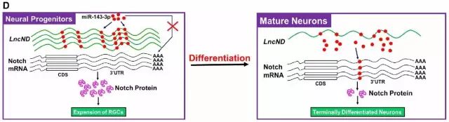 最后作者用小鼠体内实验,验证了高表达lncND可以增加神经胶质细胞数量(图ABC)以及用一个简图回顾了一下文章的主要内容(图D)。即神经分化过程中lncND的表达下调,游离miR-143-3p增多,Notch表达下降从而抑制神经前体细胞增殖并促进其分化。