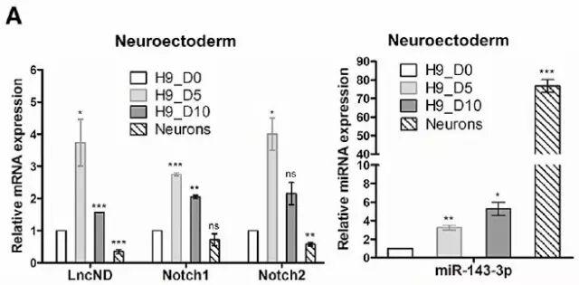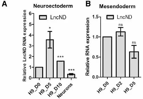 作者探究了不同分化程度的神经细胞中lncND的表达情况。利用双smad蛋白抑制诱导人类胚胎干细胞H9分化成神经外胚层细胞,在进一步分化成神经元,发现lncND在神经外胚层细胞里面是表达水平较高,而在分化到神经元细胞的时候,lncND表达水平下调了(图A)。但是,当使用BMP4和FGF2将胎干细胞H9诱导分化成中胚层细胞时,lncND的表达水平没有发生明显变化(图B)。这些说明了lncND可能神经发育过程中有特别的作用。
