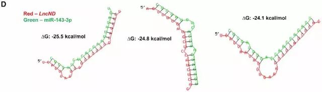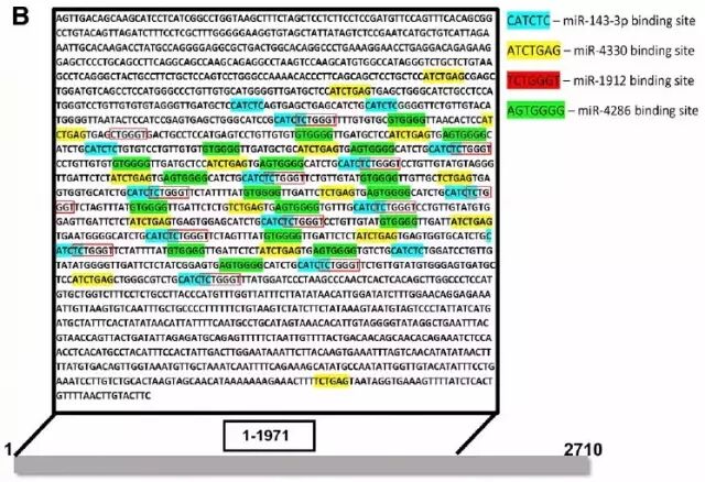 ▲ 然后作者分析了其中的一个转录本lncND。lncND 5’端1-1971碱基序列中包含的与miR-143-3p,miR-4330,miR-1912,miR-4286这4个miRNA结合的位点的个数以及位置(图B)