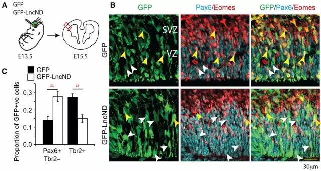 有文献报道说,Notch通路受到抑制的时候,可以促进神经祖细胞的分化。那作者就想,既然lncND可以调节Notch的表达,那么lncND在神经发育过程中是不是也扮演了一定的角色?