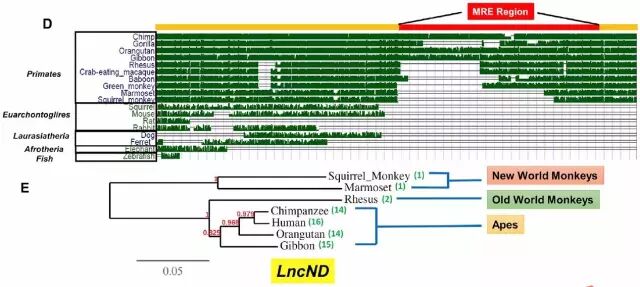 ▲ 作者还进一步剖析了lncND序列在不同物种之间同源性的一个比较,同时根据lncND序列做了进化树分析(图DE)。