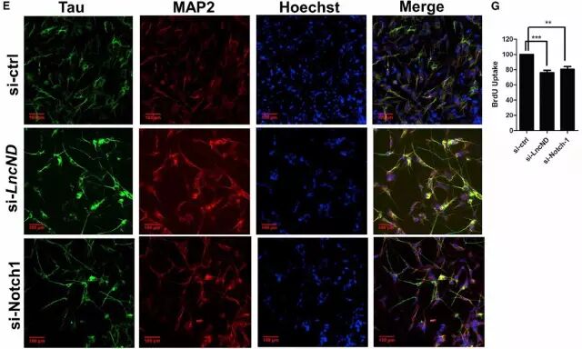 作者进一步发现lncND和Notch敲低可以使得神经母瘤细胞SHSY-5Y更多的分化成神经细胞(图EF),因为神经母瘤细胞出现了很多TAU蛋白和MAP2蛋白,这些都是神经元细胞轴突和树突的较为特异的标志物。这些说明,lncND敲低之后,Notch蛋白表达量减少促进了神经细胞的分化。而且,两者的敲低也会导致细胞增殖能力的下降(图G)
