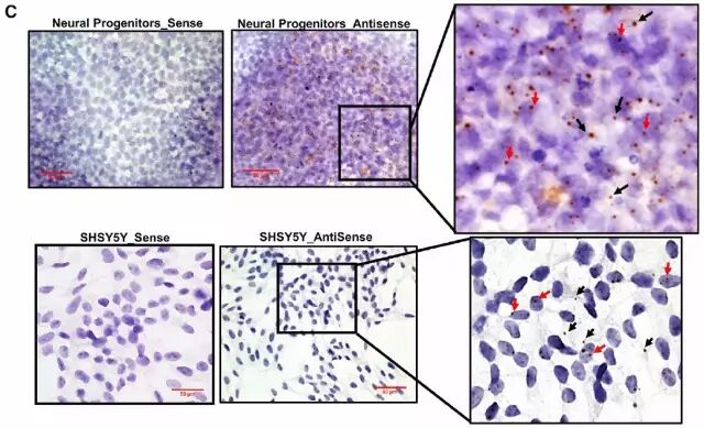 其后,作者进一步发现在Human Body Map lincRNA catalog 里面把lncND注释到正义链上是不妥的,因为用针对正义链设计的荧光探针在神经前体细胞以及神经母瘤细胞SHSY-5Y细胞里面都没有检测到lncND的信号,而针对反义链设计的荧光探针则可以在这两种细胞里面检测到lncND的信号,所以,lncND应该注释到反义链而非正义链(图C)。