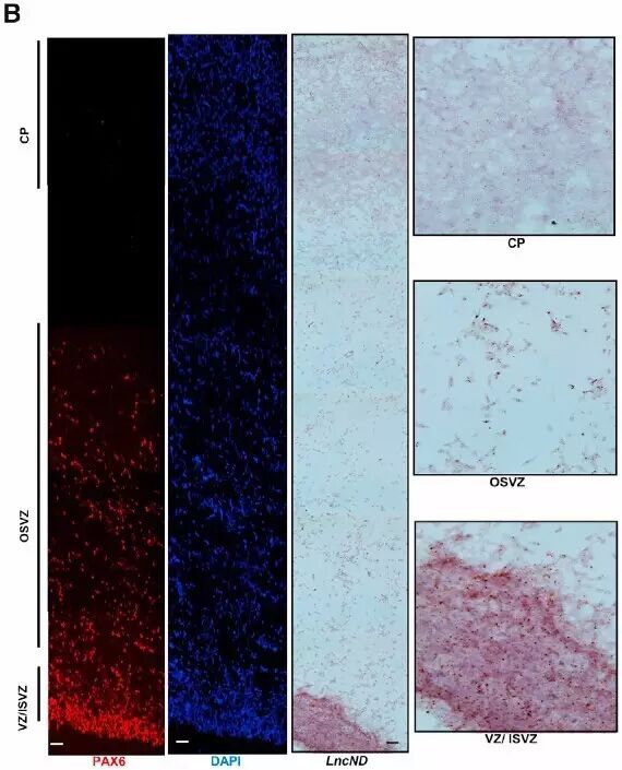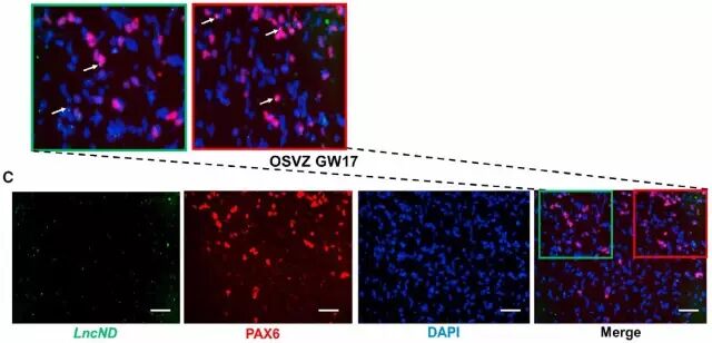 ▲ 接着作者用原位杂交检测了17月大的人类大脑皮层中lncND的表达。发现在脑室区lncND的信号很强,而外脑室下区信号很相对来说较弱,但是外脑室下区表达了lncND的细胞,同时也是PAX6阳性的放射状胶质细胞。所以lncND主要表达在脑室区以及外脑室下区中的放射状胶质细胞中(图BC)。