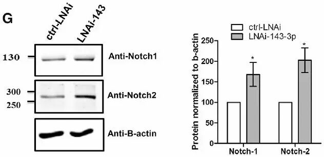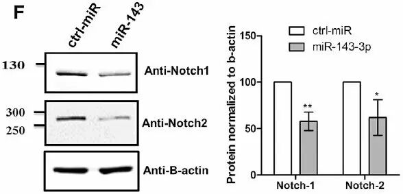 ▲ 然后进一步在基因和蛋白水平,证实miR-143-3p对于Notch1和2表达的调节作用(图DEFG)。