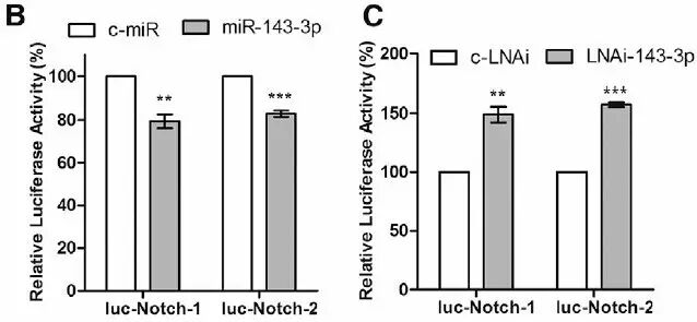 作者接下来开始分析miR-143-3p靶基因。为了证实miR-143-3p能靶向作用于Notch1和2的 3’UTR,作者又用到了荧光素酶活性实验,在过表达miR-143-3p与用LNA抑制miR-143-3p时荧光素酶活性的下调与上调,证实了miR-143-3p能与Notch1和2的 3’UTR结合(图ABC)。