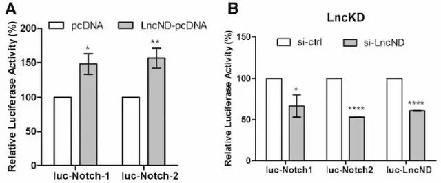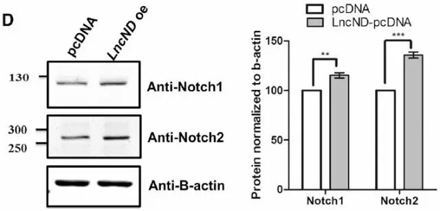 ▲ 作者接着把Notch1和2的3’UTR和荧光素酶基因融合在一起,用荧光素酶活性实验验证了在lncND过表的时候,荧光素酶活性是增高的,而lncND敲低的时候,荧光素酶活性则是降低的(图AB)。