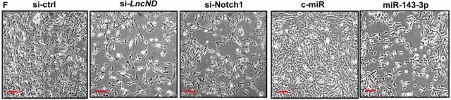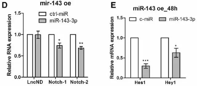 作者预测到lncND含有的许多miRNA结合位点,以及这些miRNA在Notch 3’UTR上面的结合位点个数(图C)。虽然有4个miRNA在lncND上的结合位点都比较多,但是miR-143-3p与lncND结合的热力学稳定性更高,所以lncND通过miR-143-3p发挥作用的可能性是更大(图D)。
