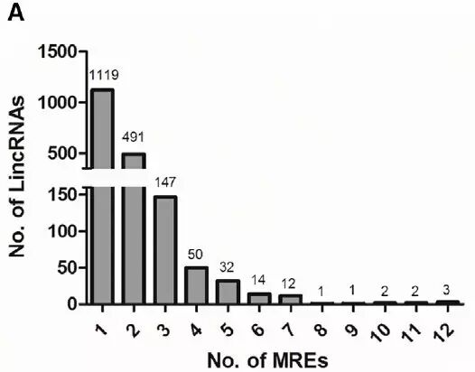 作者认为一个lncRNA含有越多的miRNA结合序列位置,则越有可能作为miRNA海绵体而发挥作用,于是作者分析出了4个lncRNA基因座,他们含有10个甚至更多的单个miRNA结合位点(图A)。