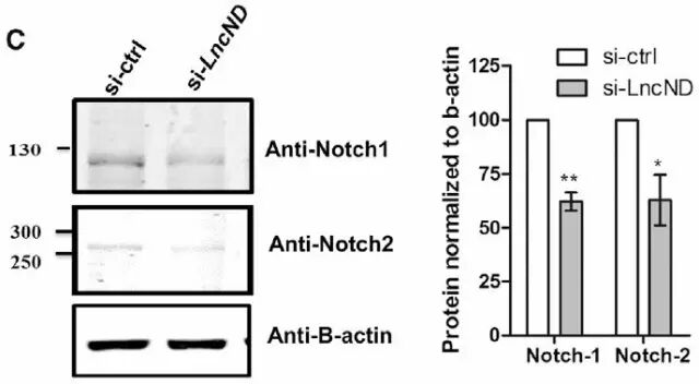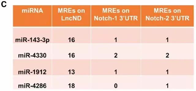 而且在蛋白水平,lncND敲低的时候Notch1和2表达水平是下降的,而在lncND过表的时候,Notch1和2表达水平则是上升的,这些证实lncND的确可以作为ceRNA调节Notch1和2的表达(图CD)。