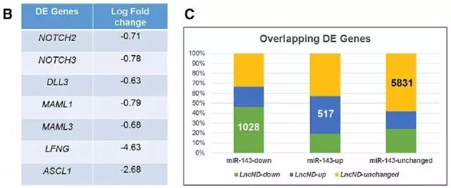 ▲ 作者用转染了miR-143-3p类似物的SHSY-5Y细胞测序结果与转染了lncND-siRNA干扰片段的SHSY-5Y细胞测序数据作比对,发现lncND敲低之后,与Notch通路相关的一些蛋白表达水平降低了。而且两者的差异基因表达趋势很大重叠的部分(图C)。
