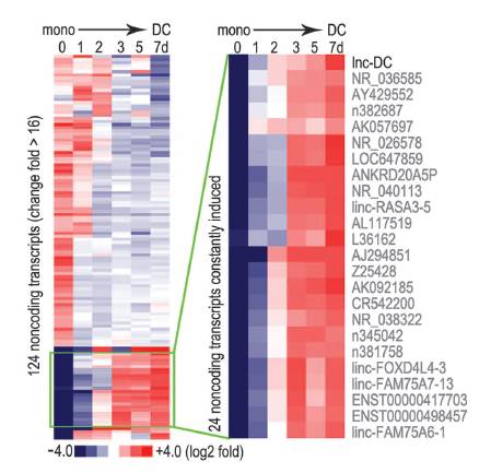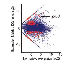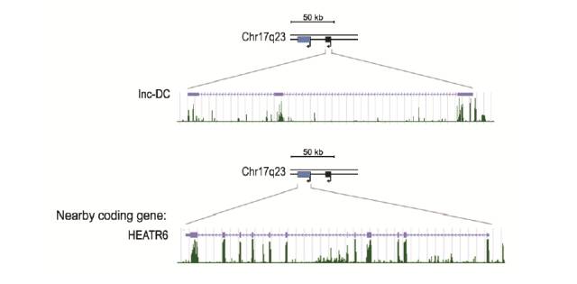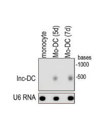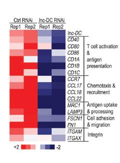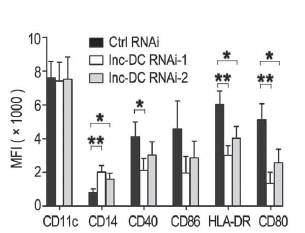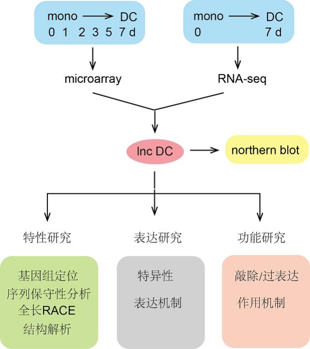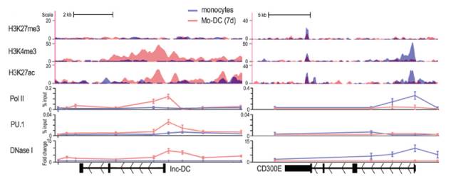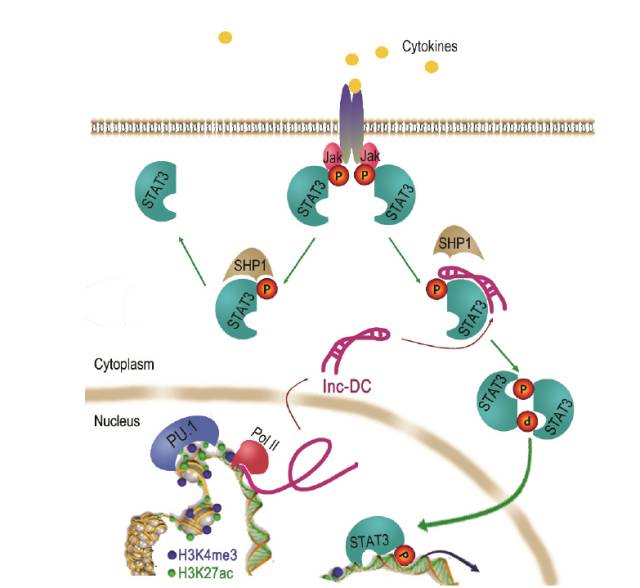 在mono分化至DC的过程中,组蛋白H3K4me3和H3K27ac的增加伴随着染色质的疏松,促进转录因子PU.1的结合,增强了lnc-DC的表达。lnc-DC转录后即转运至细胞质,与STAT3结合,阻止了SHP1对STAT3的去磷酸化,增强了STAT3的信号通路,最终促进了DC细胞的分化。
