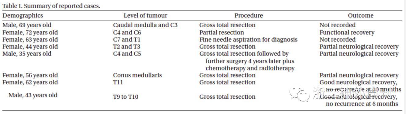 图5. 目前已报道的8例髓内黑色素性神经鞘瘤总结