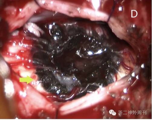 图2.术中所见:A.髓内肿瘤匍匐生长于脊髓背侧硬膜,大片黑色素沉积;B. 肿瘤质地极韧,似橡胶样,仅能用刀片剜除;C.神经根受侵犯(箭头);D.肿瘤浸润性生长,与正常脊髓边界不清(箭头),仅部分切除