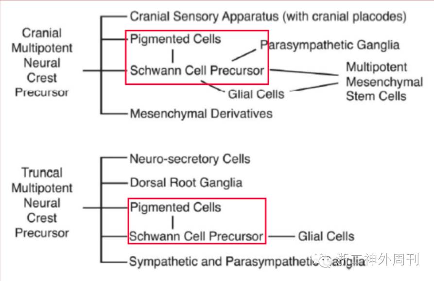 从胚胎发生学上来说,黑色素生成细胞和雪旺细胞均由多型性神经嵴前体细胞分化而来,且互相之间有联系(图6)。目前MS的形成机制有两种假说,一是神经嵴细胞在分化为雪旺细胞过程中夹杂了生黑色素细胞的成分。另一解释是成熟雪旺细胞发生了生黑色素性转化[4]。