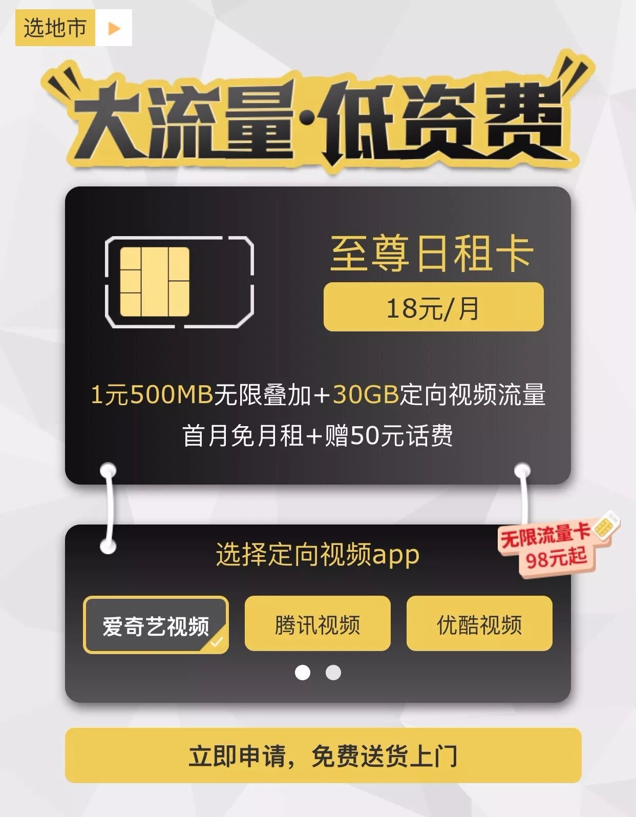 至尊日租卡,首月0月租享超大流量,更送50元话费