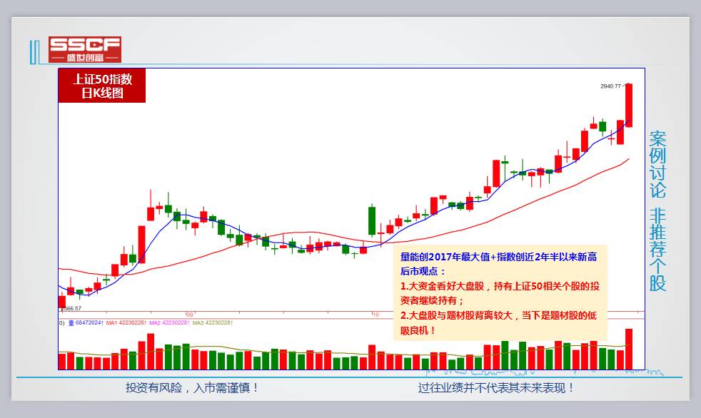 从今天涨幅最高的上证50看,量能创2017年最大值,指数更是创近2年半以来新高,后市我们认为: