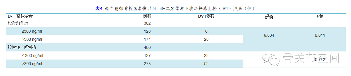 本组8例老年股骨颈骨折和22例老年股骨转子间骨折患者D-二聚体浓度≤300ng/ml但却发生下肢DVT。纤维蛋白D-二聚体是一种交联纤维蛋白降解物,它标志纤溶系统亢进以及体内高凝状态。D-二聚体浓度增高不仅见于急性静脉血栓患者而且见于老年人及多种内科病患者[15],受年龄和内科合并症如房颤、心衰和肾衰等影响[16,17,18,19,20]。此外,D-二聚体特异性不强,通常受妊娠、炎症、手术、创伤等因素的影响,预测准确性产生观察间的变异[14]。因此,对于D-二聚体阴性结果的患者,应在伤后48小时和术前1d复查D-二聚体浓度或直接行彩色多普勒超声检查排除下肢DVT。