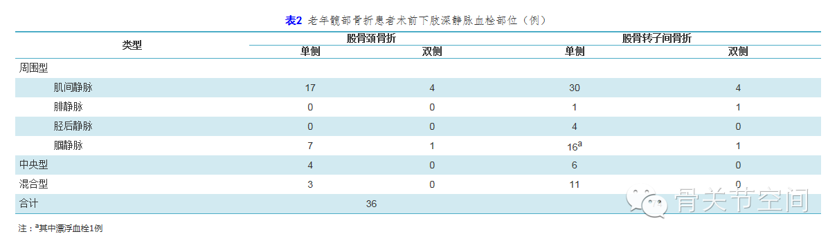 36例老年股骨颈骨折患者发生术前下肢DVT(表2)。周围型血栓29例,单侧肌间静脉血栓17例(47.2%),单侧腘静脉血栓7例(19.4%);双侧肌间静脉血栓4例(11.1%),双侧腘静脉血栓1例(2.7%)。.1%),混合型3例(8.3%),均位于骨折侧。