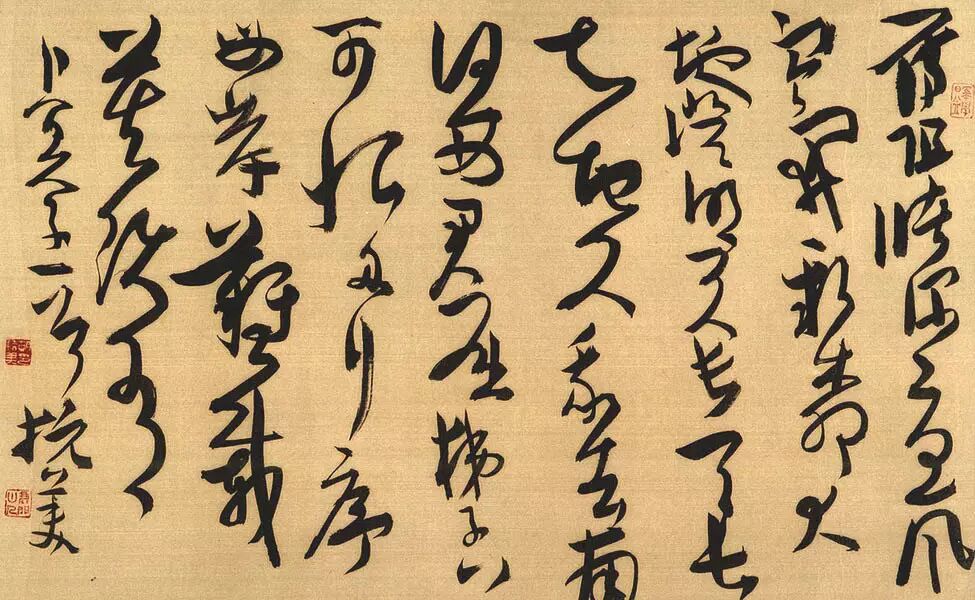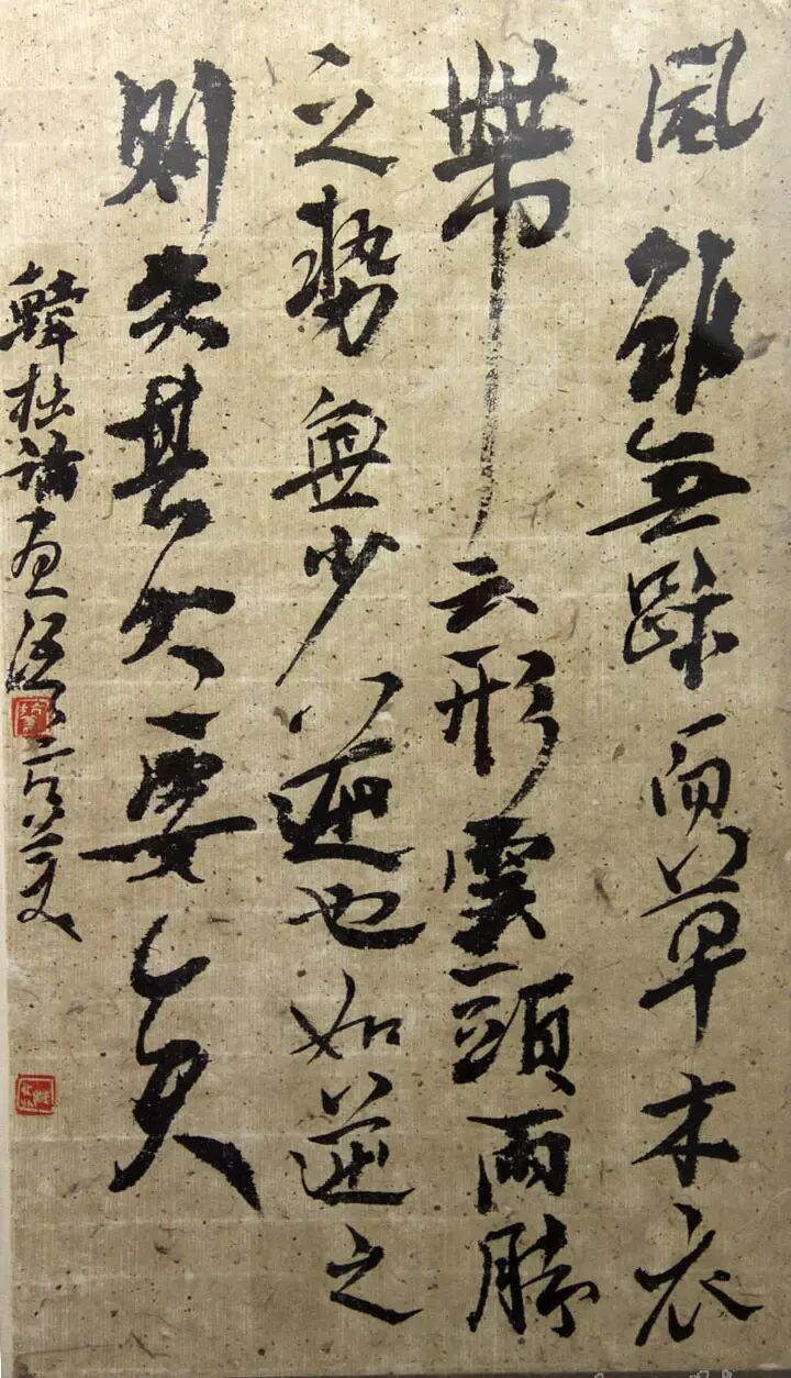 张旭是唐代的一位草圣,我们先看看唐朝同时代人是怎么评论他的。蔡希综的在《法书论》中具体描写了张旭的创作情景:“乘兴之后,方肆其笔,或施于壁,或札于屏,则群象自形,有若飞动,议者以为张公亦小王之再出。”研究一下蔡希综的这番话,对草书创作有事半功倍之效。首先,草书创作要“乘兴”。乘兴肆笔,便成功了一半。人之兴来兴去,不同海之潮涨潮落,难于呼之即来,却可挥之即去。兴是创作的欲望,是不书不快的激动。此兴半是疯狂半是静,可以酒助,可以情动,可以喜调,可以悲催,兴之极致,静在其中。兴越狂,越专注,笔狂心静,此为最佳创作状态。
