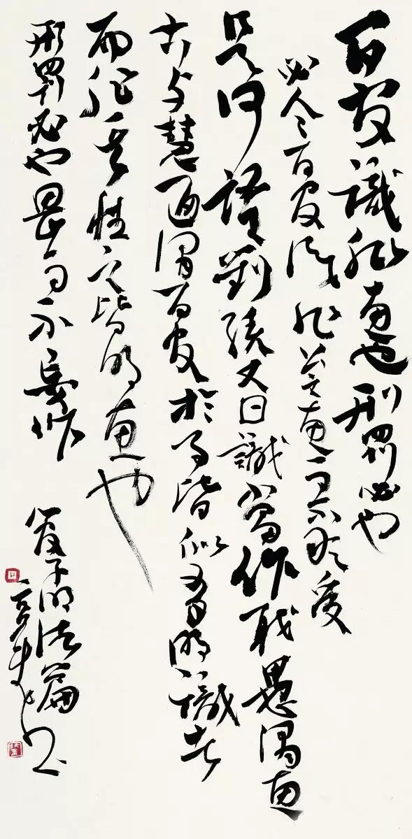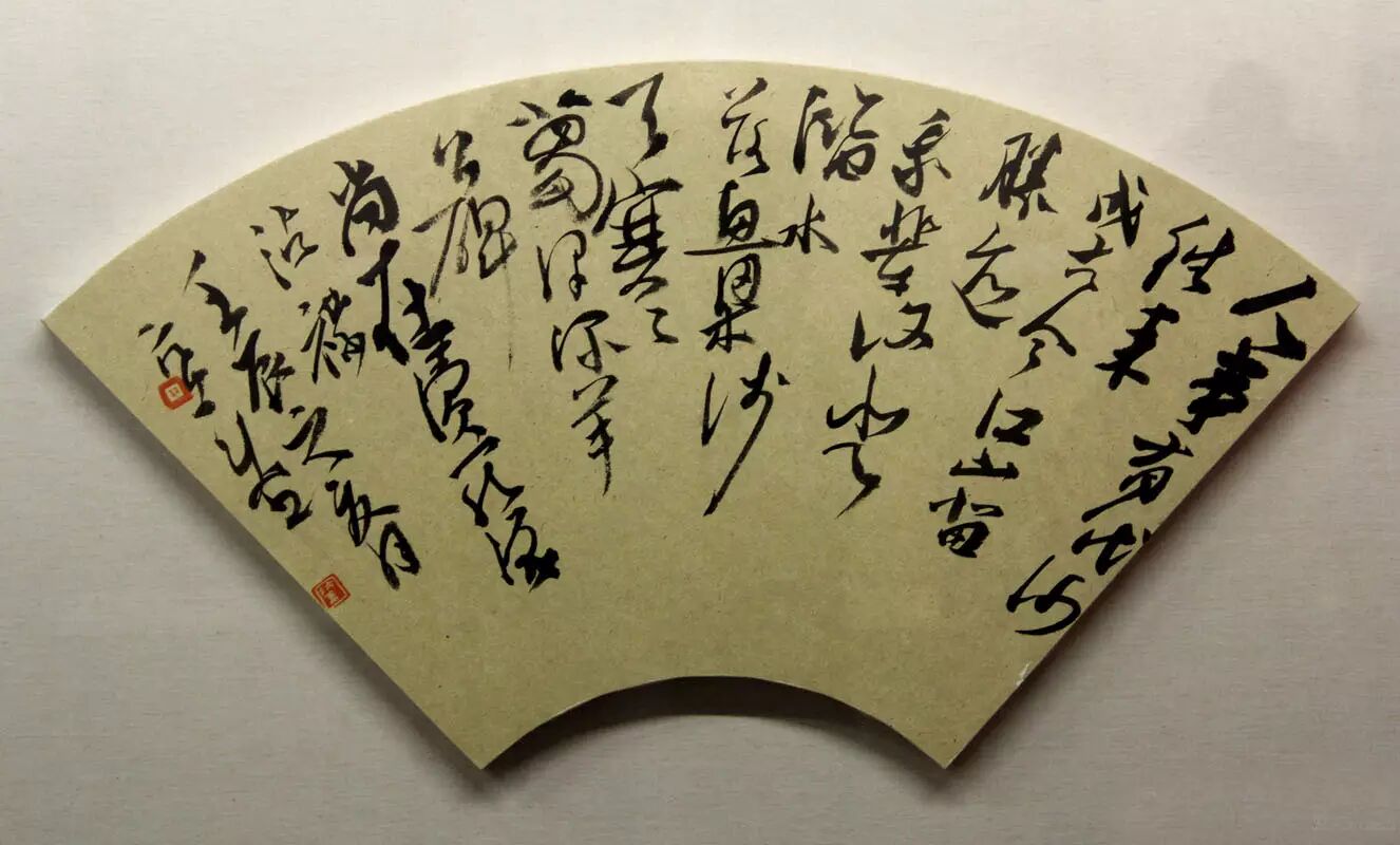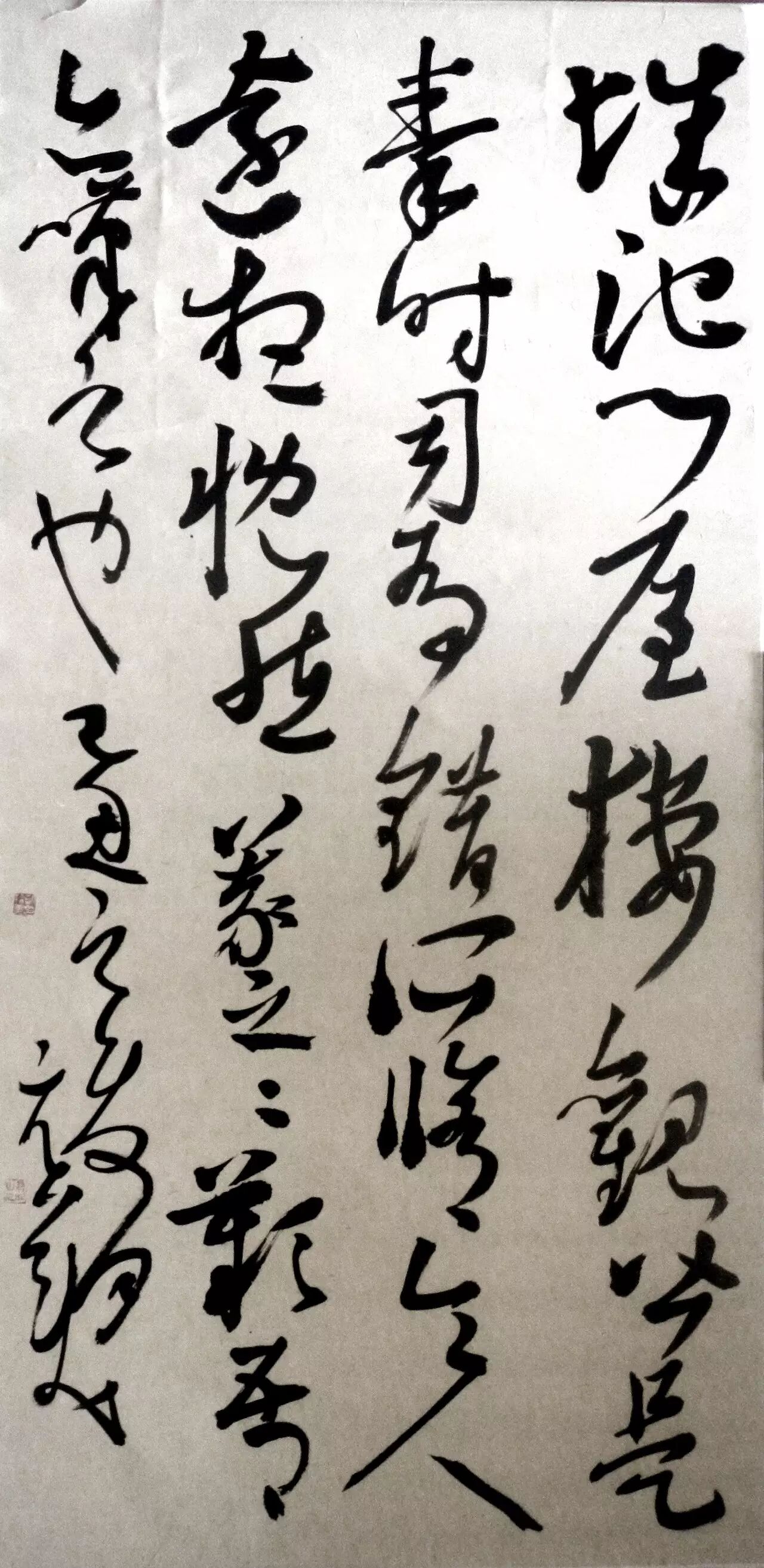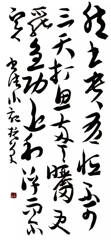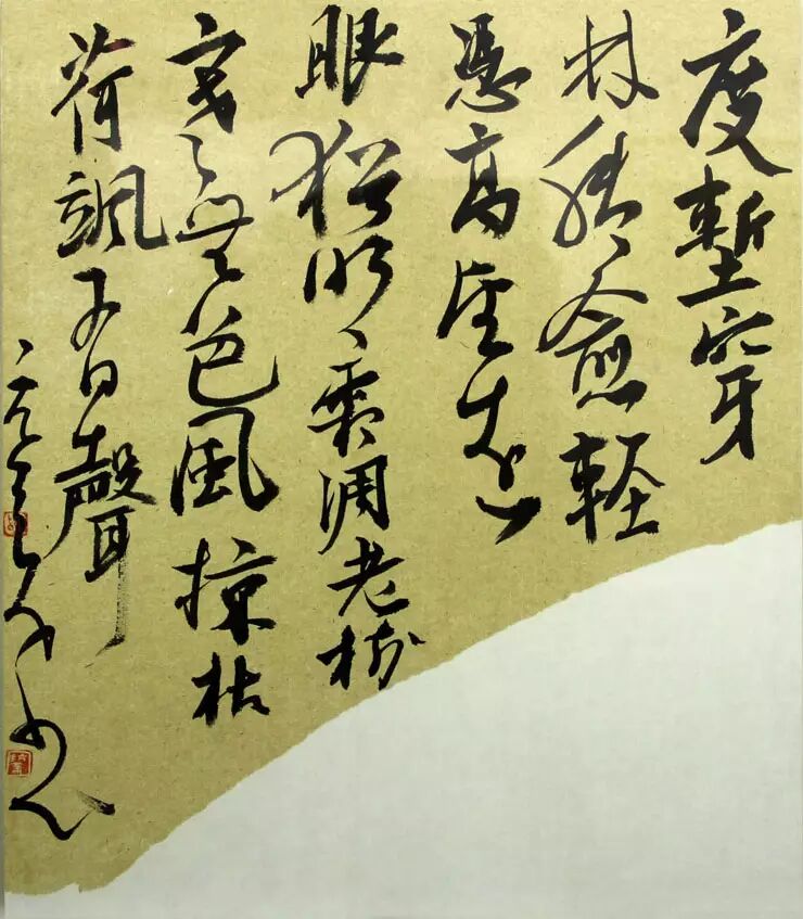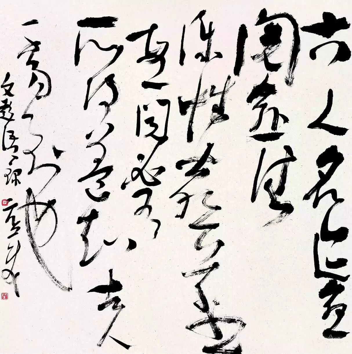 大都是以行书笔法写草书,作品基本没有草书的语言。更重要的是用行书的形体代替草书的形体,造型上没有新的起色。(笔法训练是一个漫长的过程,是“童子功”的早期训练项目。作为狂草创作,人都老大不小了,能力也老高不低的了,再去强调笔法,真是无法下手。)造型是永无止境的创新,只有造型才能形成个性和风格。“双苞”、“单苞”,撮管握笔出不了美,中锋、侧锋形不成风格。塑造一个崭新的形象,出路就在造型。