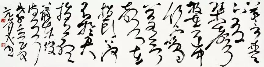 记者:草书创作中经常见的 “一笔墨”现象。“一笔墨”是指所蘸一笔墨的饱和量及所写字数的总量。一笔墨现象对创作速度关系极大,历代草书作品中比比皆是,您在自己的作品中是如何进行运用的?