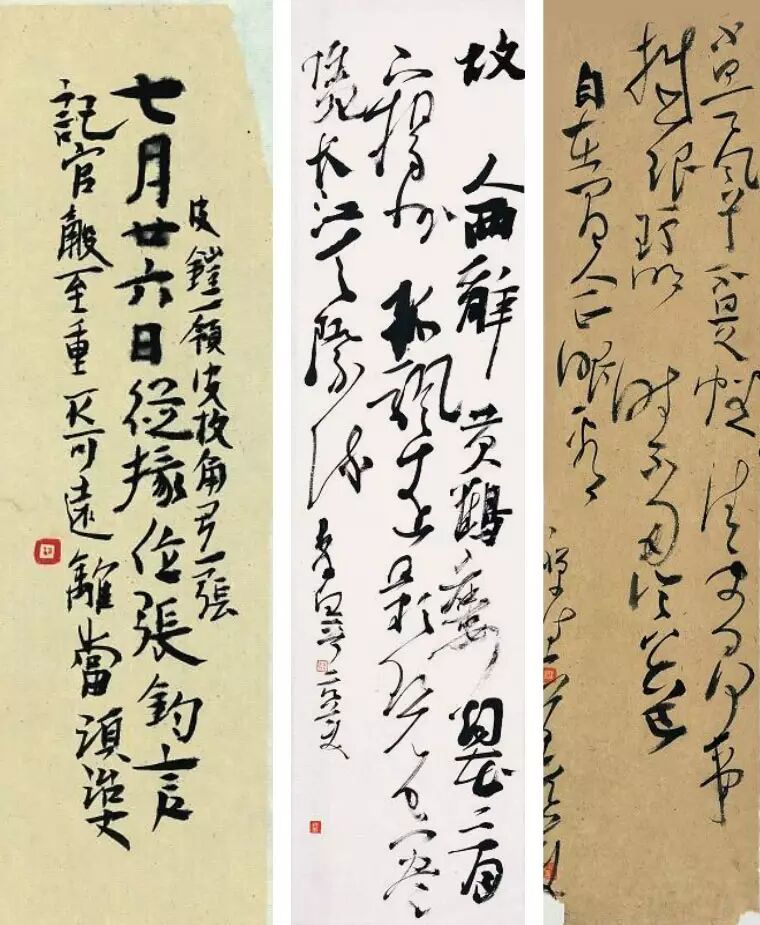非常有趣的是,快的组合中对字形的夸张一般都比较猛烈,而慢的组合中往往出现异体字,即在洋洋洒洒的大篇草书中,突然冒出一个方方正正的楷书来,象音乐中的休止符,突然来一个急停,节奏感极为明显,这在古人的作品中是累见不鲜的。