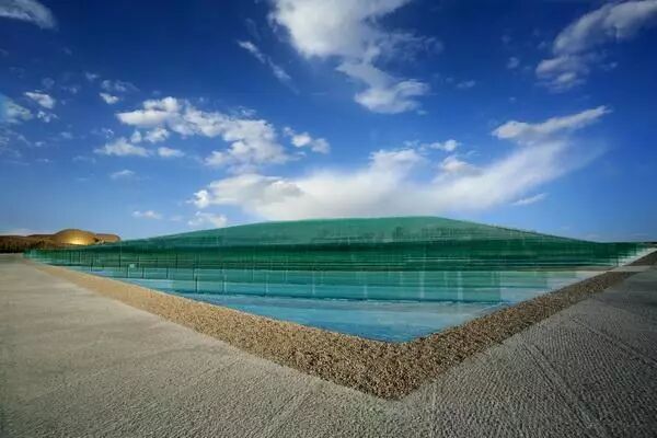 朱:绘画是材料,装置是空间,建筑是场所。讨论建筑的时候面对的场所不仅是土地,建筑坐落在大地之上。但我所说的是天地。是天地之间,这样去思考这个场所。要考虑的问题要超越建筑所覆盖的这个场地,更是周围的环境。所以就像庄子《知北游》里面讲的:天地有大美而不言。不是不说,而是不能说,说不出来,是我们要去发现它。可能建筑师面临的是一个很小的项目,单这个地方离不开天地之间。“又见敦煌”剧场就处于大漠戈壁,我用水的意向激活了沉寂的时空,将建筑与沙漠戈壁连接在一起,所以沙漠就是你的建筑场地,天地之间就会形成一个更宏大的场面。虽然我们的剧场很小,在沙漠里只是一点点,但他所形成的效果和沙漠就形成了一个对话。如果从发现的角度来说,天地之间不只是空间,还有时间,还有历史的积淀。从东汉传到中国,五台山就变成了非常重要的的一个地点,可以看到浑厚的山体,可以同时欣赏到四时的景致。五台山美妙雄浑的景观感染了我,我就想建筑要做到多么宏大规模才能跟那个场地去抗衡?我想到做多大都没有用,我设计了7道折墙,折墙上使用了大量不同的反光材料映照着天光、山影,光线的变化会呈现不同的颜色和效果,把所有外部的空间全部包裹或是吸收进来,那都是我的空间,这样建筑就跟环境融合在一起,天地日月山川树石都是你的。