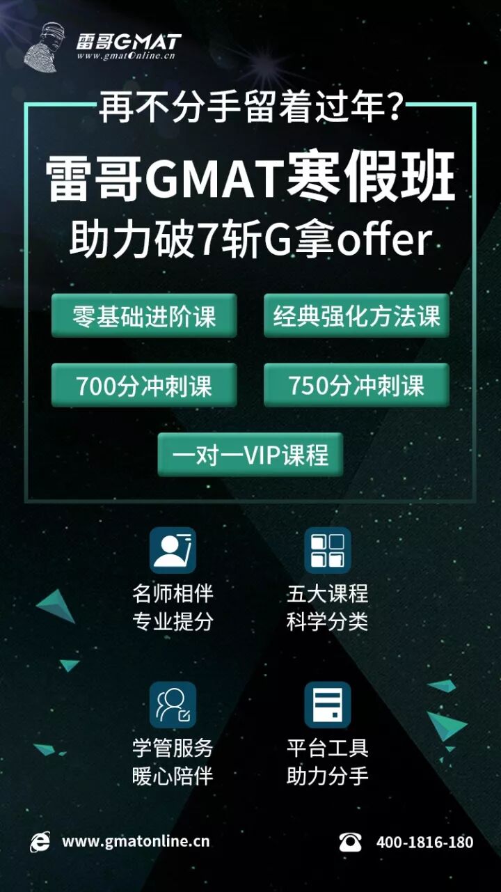 当然,大牛的经验要参考,自身的技巧提升跟思维方式培养也很重要。雷哥GMAT寒假班火热预售中,五大课程(零基础进阶课、经典强化方法课、700分冲刺课、750分冲刺课、一对一VIP课程)助力分手,现在报名还享钜惠!