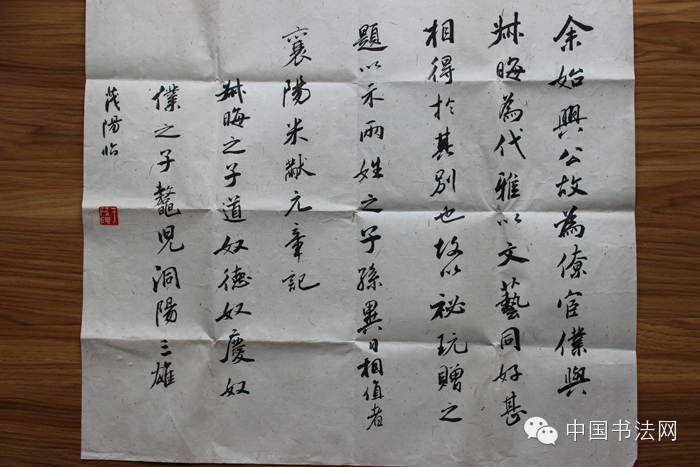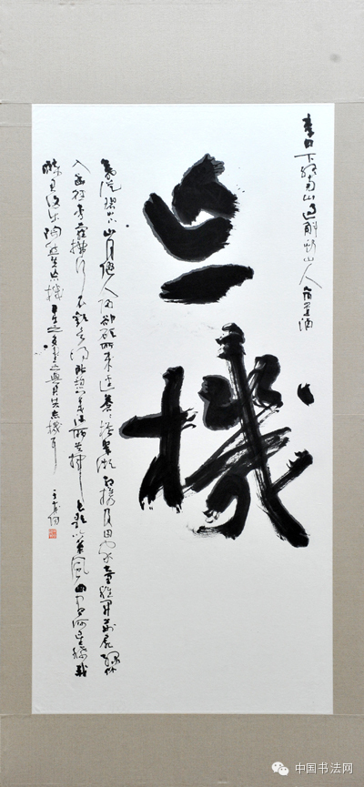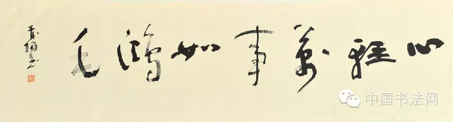 观茂阳刷字。一日,酒至微醺,茂阳慨然道:习书五十余年,习米芾三十余载,今日始得悟,米字核心在一“刷”字,而“刷”的精髓在于铺毫中锋。我问道:“铺毫中锋”之说出于何人?茂阳道:出自于鄙人。我说:光说不练嘴把式,何不演示一番?茂阳遂调墨展纸,挥洒起来。只见他轻捏笔管,不急不徐,随手涂抹,信笔刷来,如庖丁解牛,游刃有余。不多时,。其用笔铺毫运行,自然调锋,线条内敛而雄浑。其结字能简则简,清爽干净。整幅作品古拙朴茂,清简典雅。“刷”毕,茂阳掷笔大笑,我则连连击掌,叹道:“刷”的好。真真有两把刷子也。相携入座,连浮几大杯,尽欢而散。