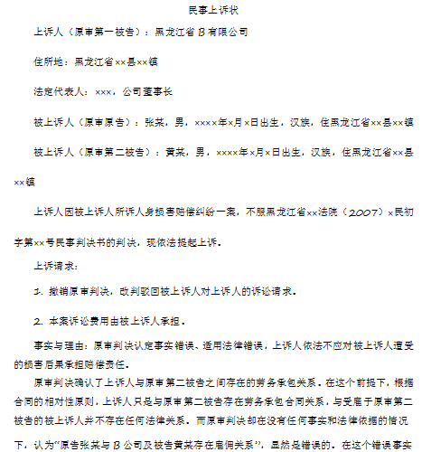 从写作方法的角度看,上诉状的写作要比其他法律文书容易一些。因为它针对的目标是原审判决。只要准确地指出原审判决在程序上的违法之处或者实体上事实不清、适用法律错误等项中的任何一项,就可能达到上诉目的。但是,如何才能做到“准确地指出”,却不是一件容易的事情。以本案为例,这两份上诉状都在B公司与黄某之间究竟存在怎样的法律关系上花费了很多心思,力图通过立论的方式来否定原审判决认定的事实。但是,并未达到预期的效果。究其原因,就在于采取的方法不当。上诉状不同于代理词,需要洋洋洒洒成百上千字才能把观点表述到位、说清说透。上诉状的主要作用,在于以尽可能短的篇幅、尽可能精练的语言,准确地指出原审判决在程序上和实体上存在的不当之处,使二审的承办法官能够在最短的时间里以最快的速度认识到原审判决存在的问题,然后带着这些问题去研究原审的卷宗材料。