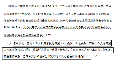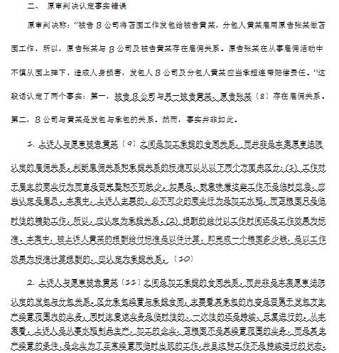 〔10〕 这一段存在以下三个不当之处:第一,观点错误。根据学理上的解释,加工合同需要由定做人提供原材料或者半成品,承揽人按照具体要求进行加工制作,然后将工作成果交付给定做人。而本案中所谓的“苫粮囤”,只是将储存粮食的粮囤用苇席或者苫布等物品遮盖严实,不存在加工制作的问题。第二,提出的区分雇佣关系和承揽关系的标准不准确。如果用这两个标准衡量的话,还可能存在第三种关系——劳动关系。第三,从案情来看,B公司与黄某之间确实存在雇佣关系,关键问题是,B公司与张某之间是否也存在雇佣关系。这位律师忽略了一个案件事实——B公司只是雇佣了黄某,并未雇佣张某。因为B公司只是将报酬支付给黄某,黄某领取报酬后再与包括张某在内的另外5人进行结算。据此可以认定,本案中实际上存在两个层次的雇佣关系,即B公司雇佣黄某,黄某雇佣张某。在这种情况下,如果是黄某受伤,,雇主应当承担赔偿责任”的规定承担赔偿责任。而B公司与张某之间并不存在雇佣关系,张某的赔偿责任不应由B公司承担。