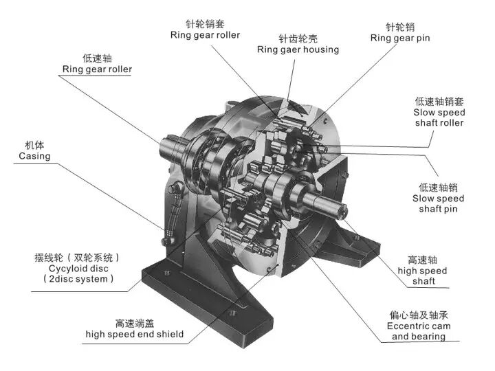 摆线针轮减速机全部传动装置可分为三部分:输入部分、减速部分、输出部分。在输入轴上装有一个错位180°的双偏心套,在偏心套上装有两个滚柱轴承,两个摆线轮的中心孔即为偏心套上转臂轴承的滚道,并由摆线轮与针齿轮上一组环形排列的针齿相啮合,以组成齿差为一齿的内啮合减速机构,(为了减小摩擦,在速比小的减速机中,针齿上带有针齿套)。