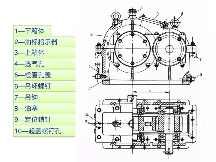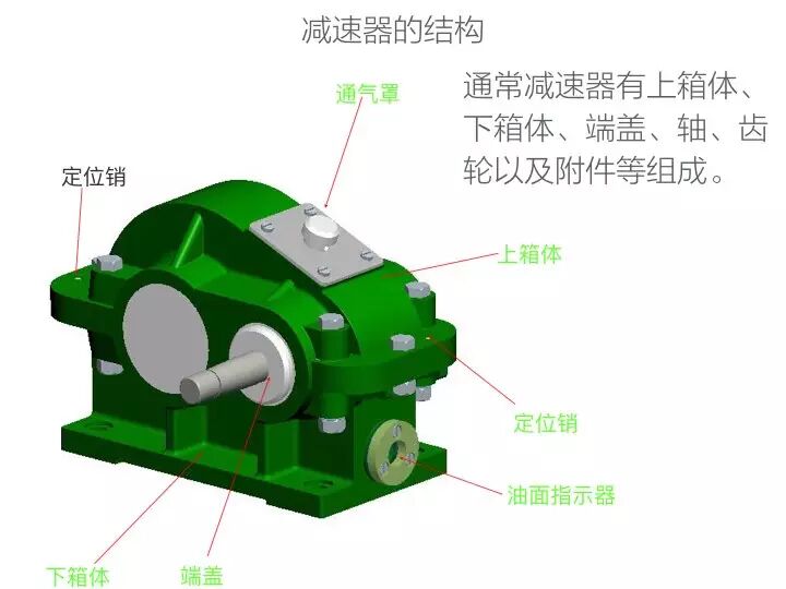 组成:由密闭的箱体、相互啮合的一对或几对齿轮(或蜗轮蜗杆)、传动轴及轴承等所组成。