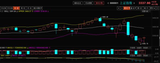 上证日线二连阳,初步有脱离布林通道下轨的牵引,今日预计会再测试昨日下影线的支撑力度,若能开盘就在3330点上方并继续上攻,那么会将60分钟的反弹行情继续推进,甚至探出短期底部。操作上,除了周期股等大板块外,其他先少动多看,适当控制仓位。