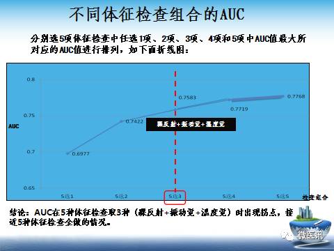 其结果是5项筛查中任选1项、2项、3项、4项、5项的组合,并计算曲线下面积(AUC),取最大值分别为0.7009、0.7532、0.7786、0.7838、0.7921。AUC在5种体征检查取3种(踝反射、振动觉和温度觉)时出现拐点,接近5种检查全做的AUC值,踝反射、振动觉和温度觉组合为最优筛查组合,与NET符合性好,可作为筛查DPN的简便、有效的方法。但是,有关最佳组合的选定是一个复杂的需要进行深入研究的问题,有待于多中心、大样本、横断面调查,使用电生理检查进行对照研究,进一步深入探索。无论怎样,常用的5种筛查选择其中的任何一种都不能得到高的敏感性和特异性的结果,5种筛查全部选用在临床应用,费时、繁杂,所以,研究最佳组合的筛查方式非常必要。