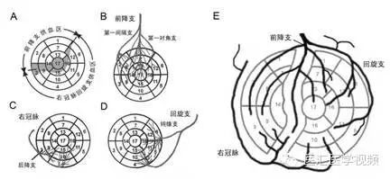A. 灰色区域可以由前降支、右冠脉或回旋支混合供血;B. 前降支供血区;C. 右冠脉供血区;D. 回旋支供血区;E. 沿室间隔将左室分为室间隔和其余左室壁两部分,并显示冠脉在左室分布的示意图(引自参考文献[1~5])