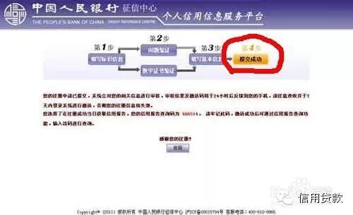 完成后平台进行身份验证,第二天反馈验证结果给用户,您可以通过手机获得验证结果。注册成功用户的反馈信息中包含个人信用报告查询激活码,这个必须牢记,后面查询要用到。