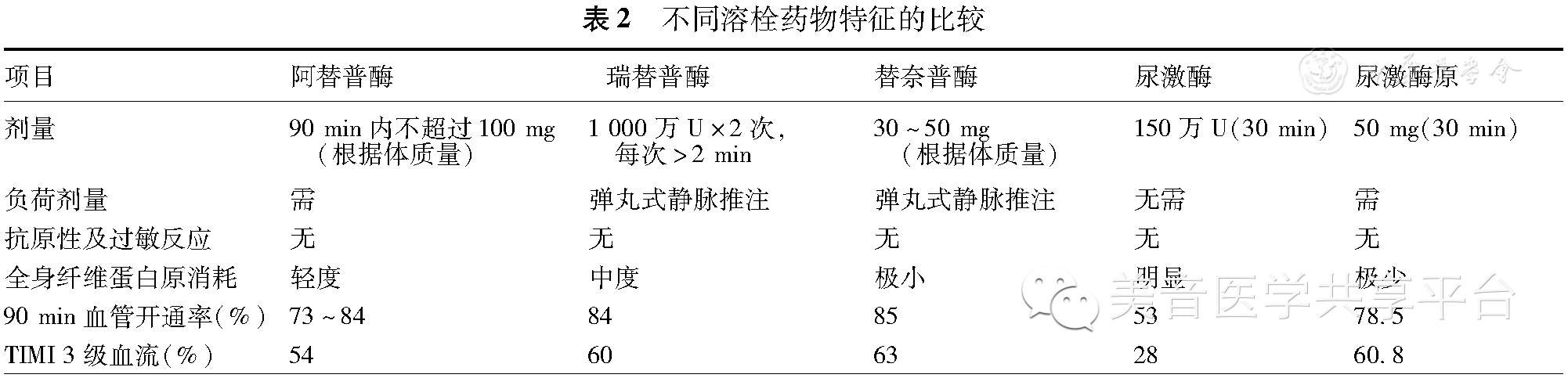 建议优先采用特异性纤溶酶原激活剂。重组组织型纤溶酶原激活剂阿替普酶可选择性激活纤溶酶原,对全身纤溶活性影响较小,无抗原性,是目前最常用的溶栓剂。但其半衰期短,为防止梗死相关动脉再阻塞需联合应用肝素(24~48 h)。其他特异性纤溶酶原激活剂还有兰替普酶、瑞替普酶和替奈普酶等。非特异性纤溶酶原激活剂包括尿激酶和尿激酶原,可直接将循环血液中的纤溶酶原转变为有活性的纤溶酶,无抗原性和过敏反应(表2)。